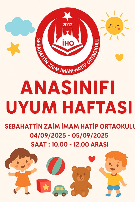 Okulumuz da yapılacak olan anasınıfı uyum haftası 4-5 Eylül tarihlerinde saat 10.00-12.00 arasında yapılacaktır. Tüm öğrencilerimizin katılmasını rica ederiz.